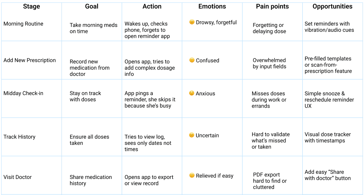 ❤️ Feels✋ Does Overwhelmed, anxious, forgetful Ignores reminders, writes notes manually Relieved when app works as expected Uses app to check meds before doctor visit