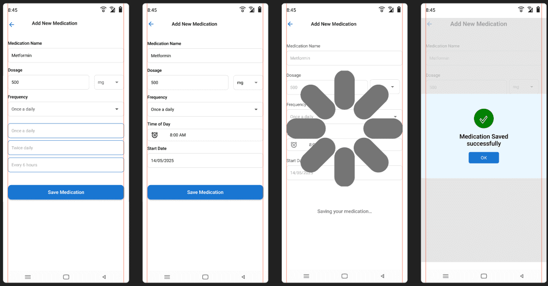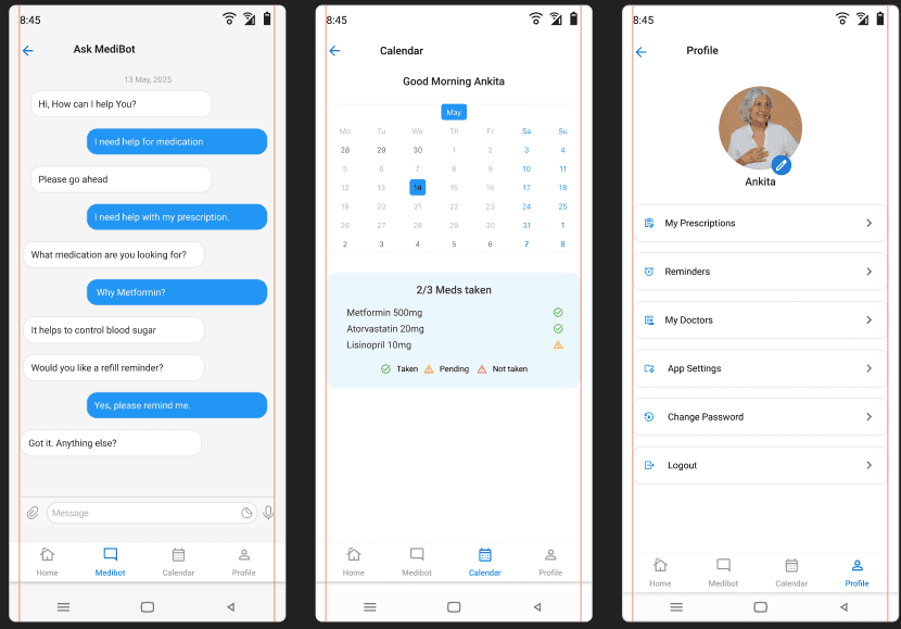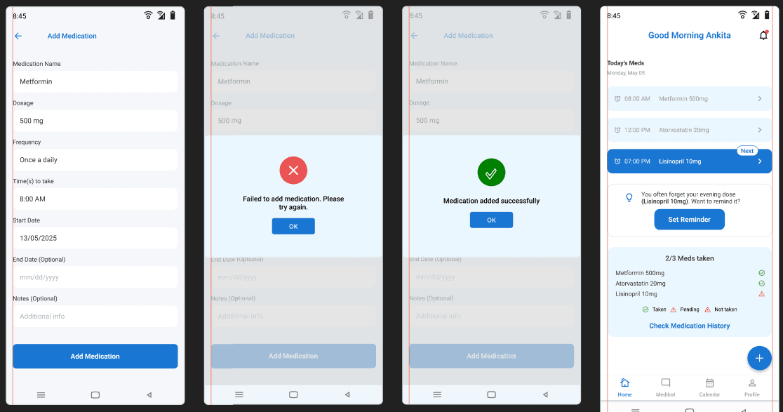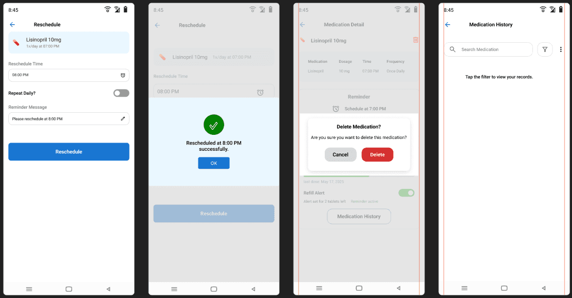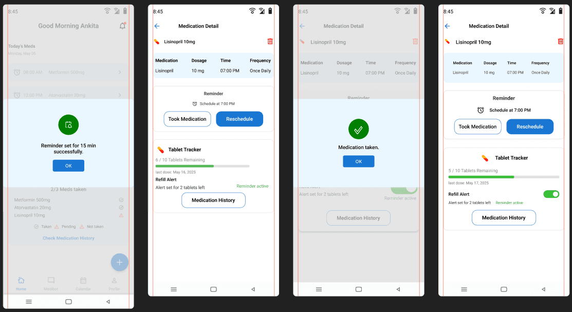 The final prototype offers a streamlined, user-friendly experience tailored to the needs of medication-dependent users. It balances clinical reliability with emotional comfort through soft visuals and clarity.