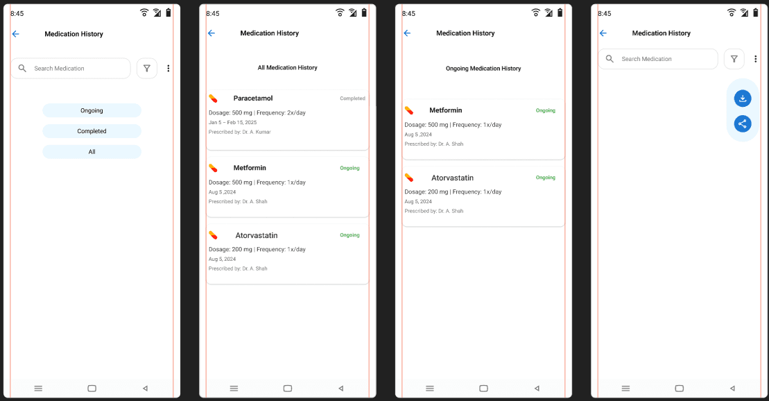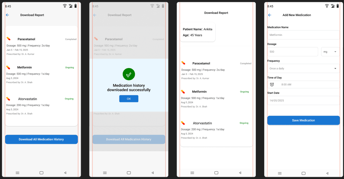 The app helps users take medications on time through timely reminders, allows them to reschedule doses, and maintains a clear medication history. Users can also download and share their medication details with caregivers or family members for better support and transparency.